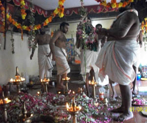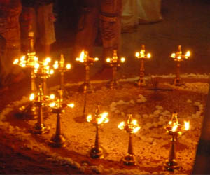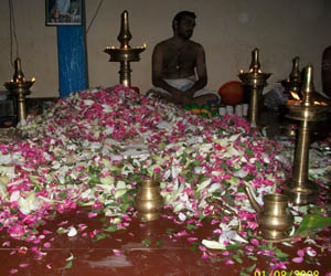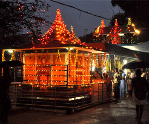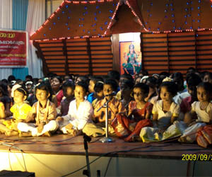 The Navarathri mandapam and the Aanapandal become alive with classical concerts during Navarthri days. Nine days of dance and music makes the navarathri fest a glorious celebration. It is in the month of Kanni(September-October). Mostly small children's 'Arangettams'- the debut performances- are conducted here then. Thousands of devotees throng the temple these days. Small children are initiated to the world of learning on 'Vidyarambha mandapam' of the temple on Vijayadashmi day.